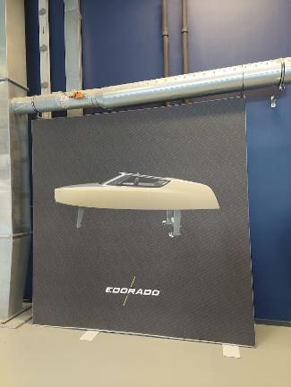 In the first photo we can see a poster made by Da Vinci students for a Jazz festival. In the second photo we can see the innovation potential of a startup company which is located in the Sustainability Factory: it is an electrical boat.